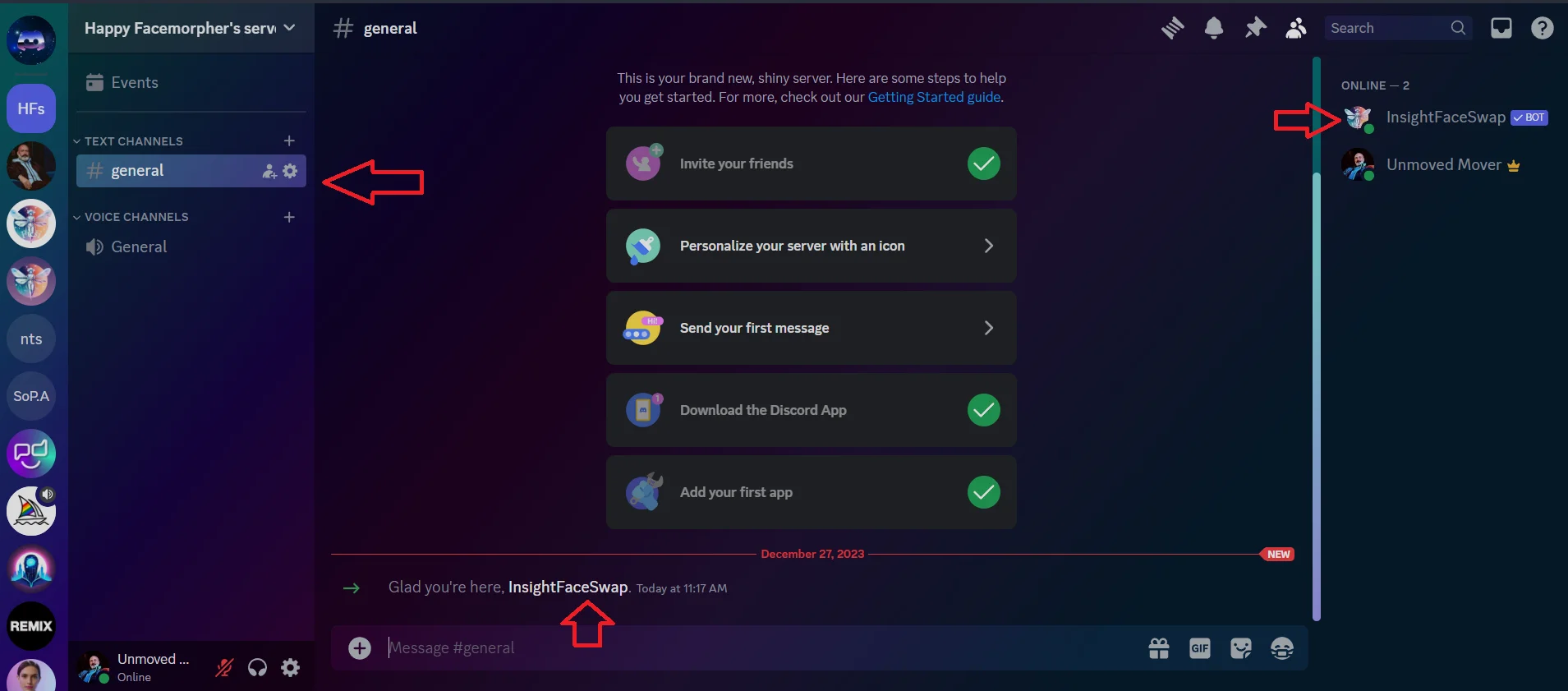 - Bot Invitation: Use this invitation link: https://discord.com/api/oauth2/authorize?client_id=1090660574196674713&permissions=274877945856&scope=bot to invite the "InsightFaceSwap" bot to your server.