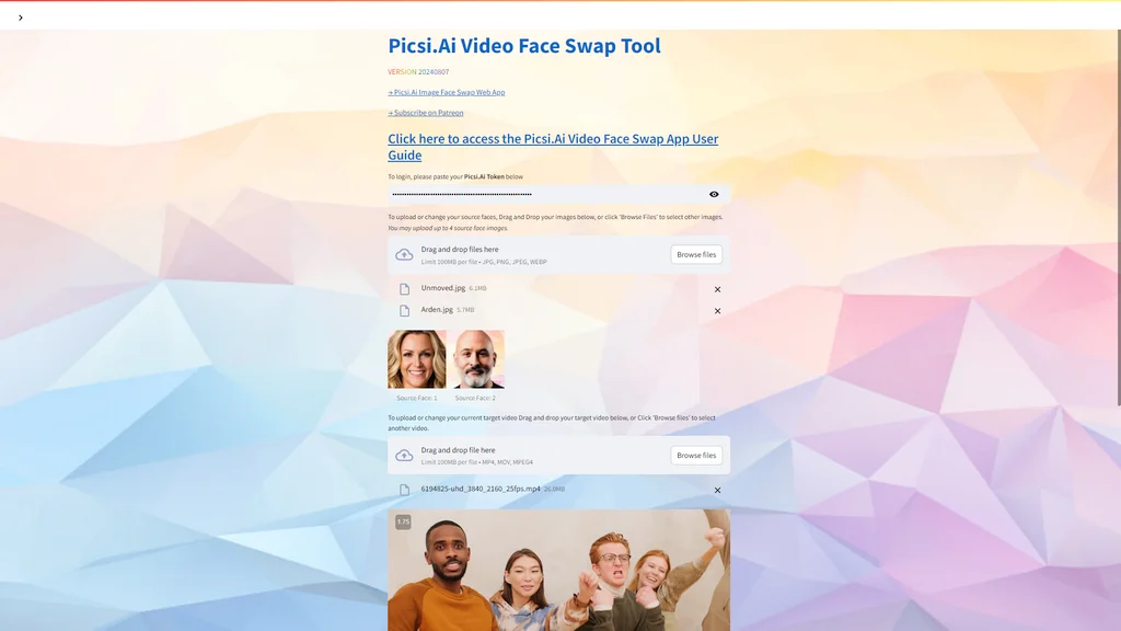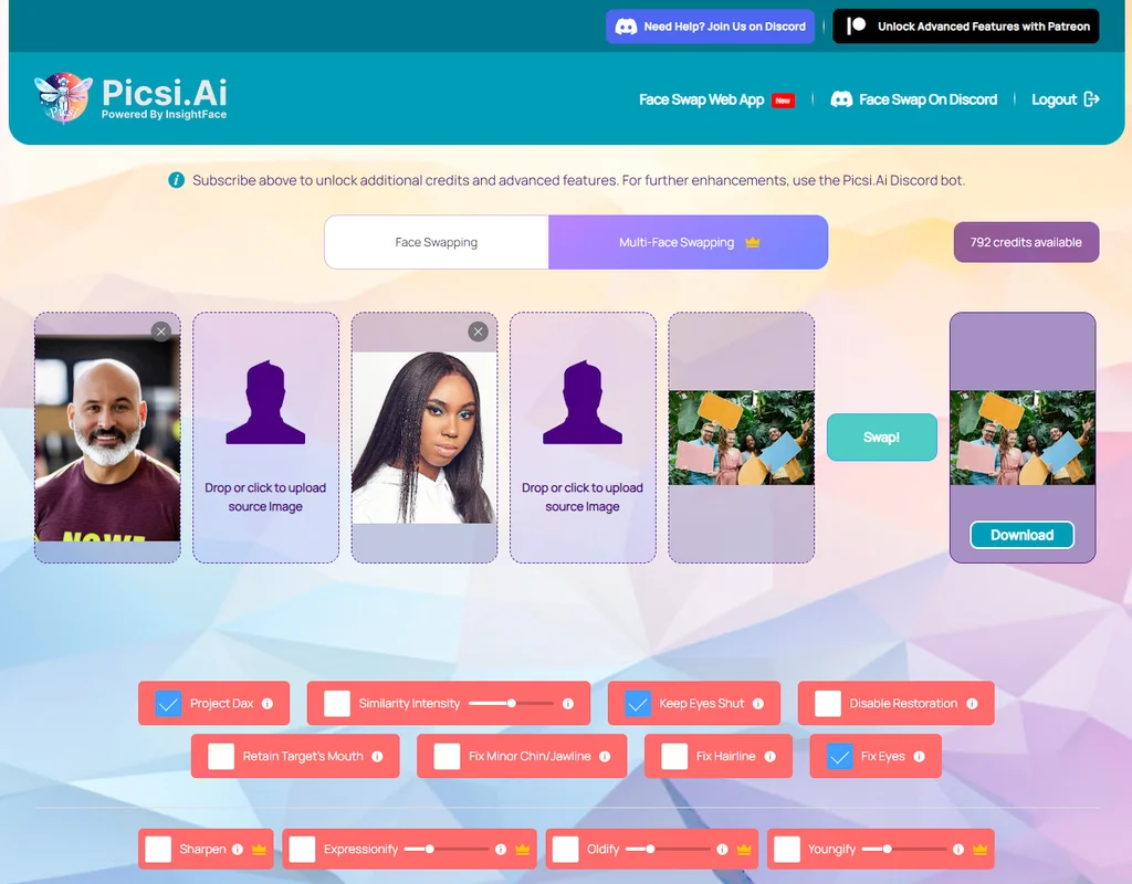 - New Platform: Access face swapping online through www.Picsi.Ai/FaceSwap or MultiFaceSwap, without needing to install or run Discord.